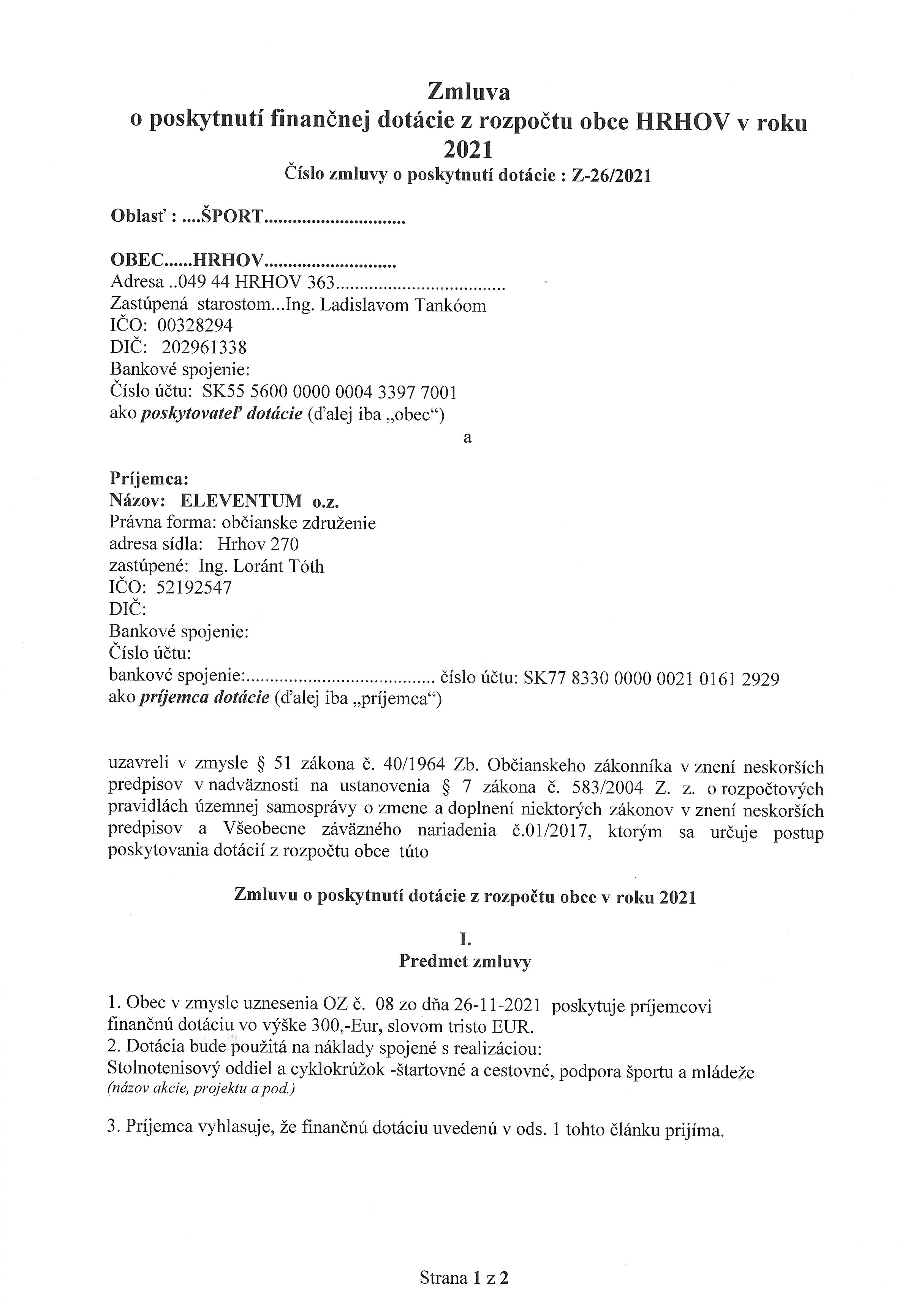 - Názov zmluvyZmluva o poskytnutí finančnej dotácie z rozpočtu obce Hrhov na rok 2021 pre OZ ELEVENTUM