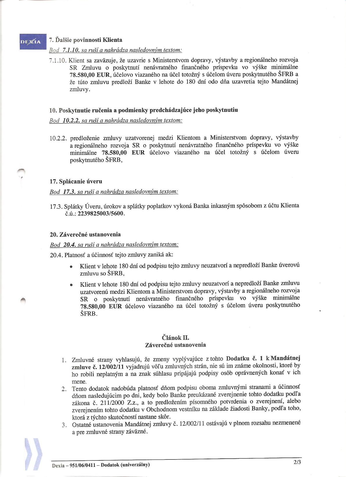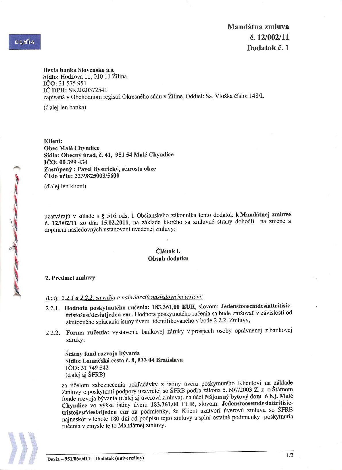 - Názov zmluvyMandátna zmluva č. 12/002/11 Dodatok č.1