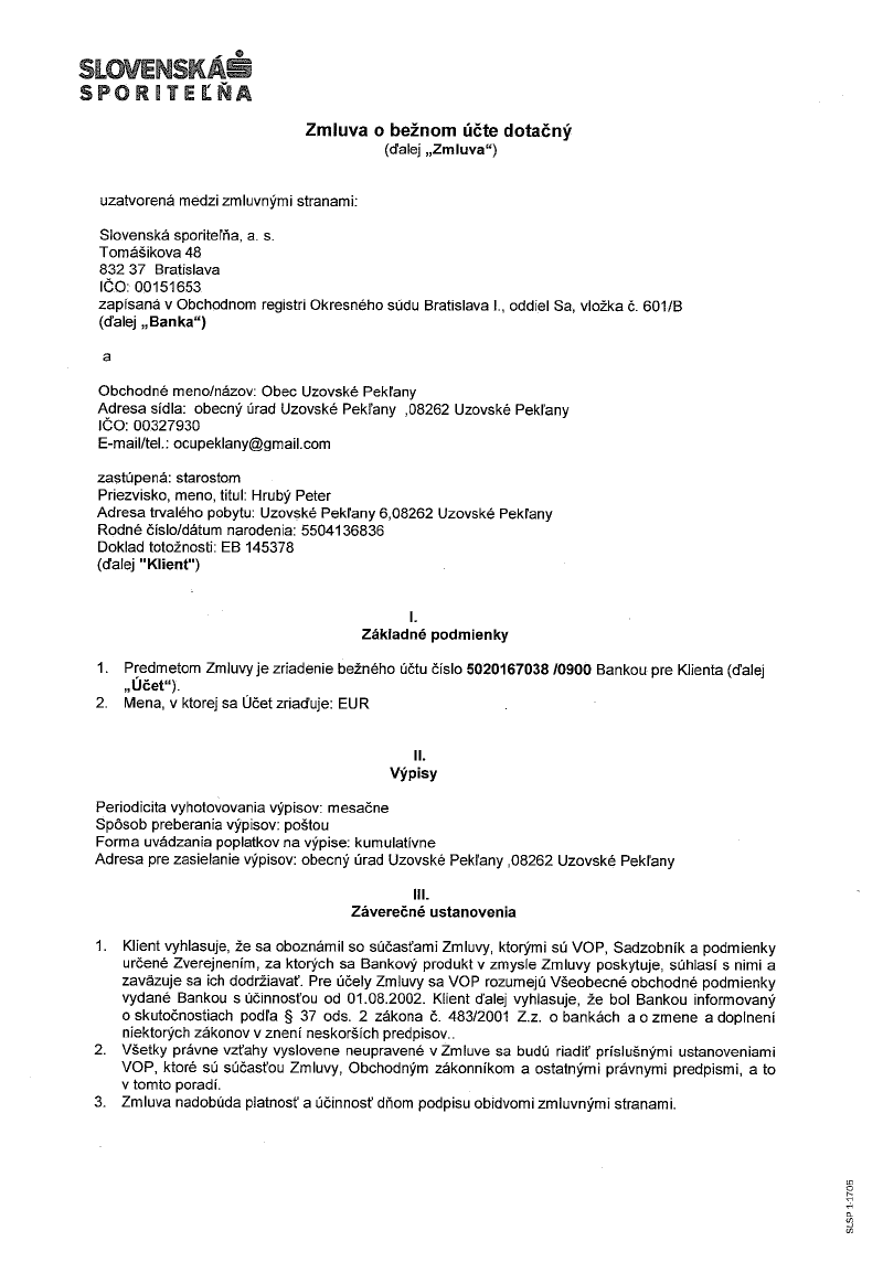 - Názov zmluvyZmluva o bežnom účte dotačný