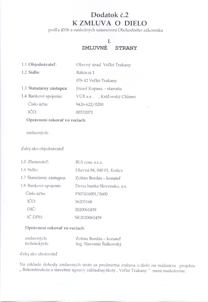 - Názov zmluvyDodatok č. 2 k zmluve o dielo na realizáciu projektu "Rekonštrukcia a stavebné úpravy základnej školy, Veľké Trakany"